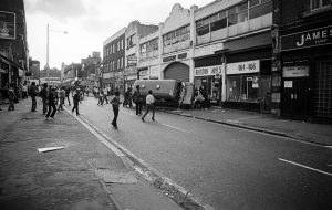 Coldharbour Lane later in the day as things start to turn unpleasant. The police were making snatch raids on ringleaders using vans, which in those days had no riot protection.